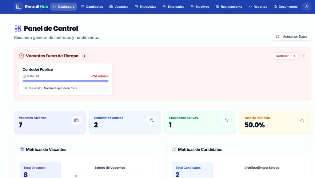De Rotación, Cobertura, Métricas de Candidatos, Mide el rendimiento de tu equipo de reclutamiento, todo en tiempo real y automatizado.